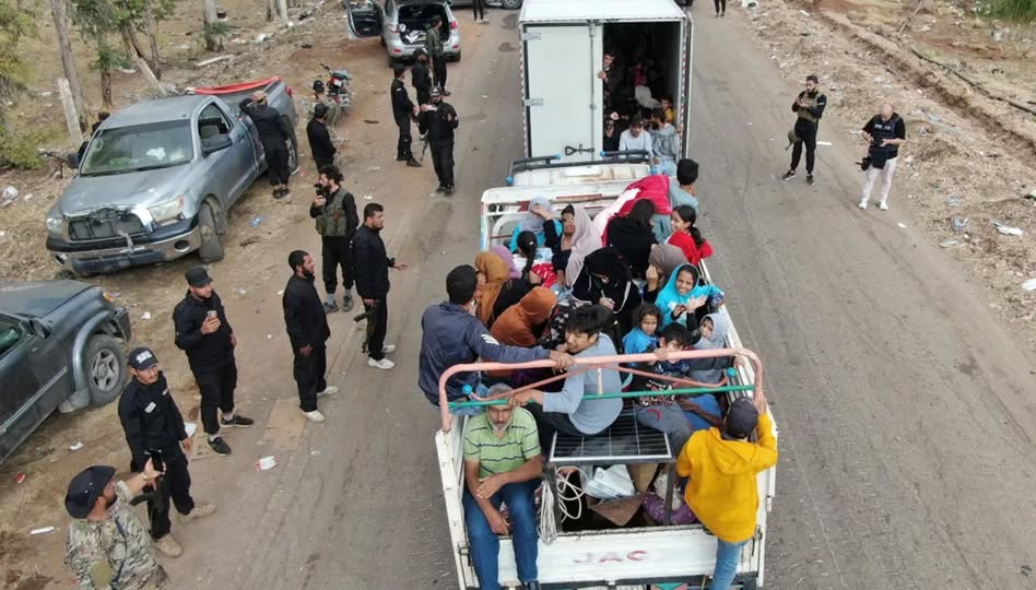 شاحنة تنقل أفراداً من مجتمع البدو أثناء إجلائهم من السويداء. (أ ف ب)