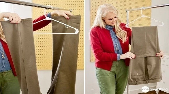 إلا أن هذه الطريقة التي شرحها الموقع، ستمنع حدوث ذلك، حيث يتم في البداية فتح السروال بشكل مقلوب قبالة العلاقة، وطوي أحد جانبيه فوق العلاقة، ومن ثم ثني الجانب الآخر فوقه.