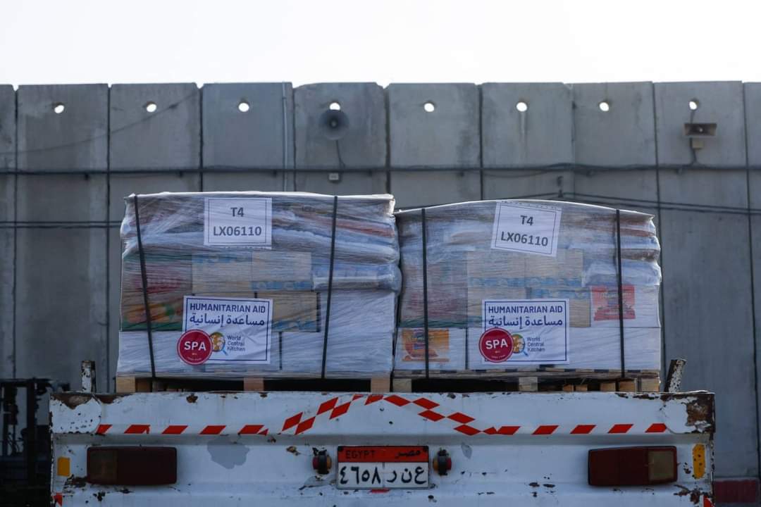 قوافل تحمل المساعدات عند معبر كرم أبو سالم (رويترز)