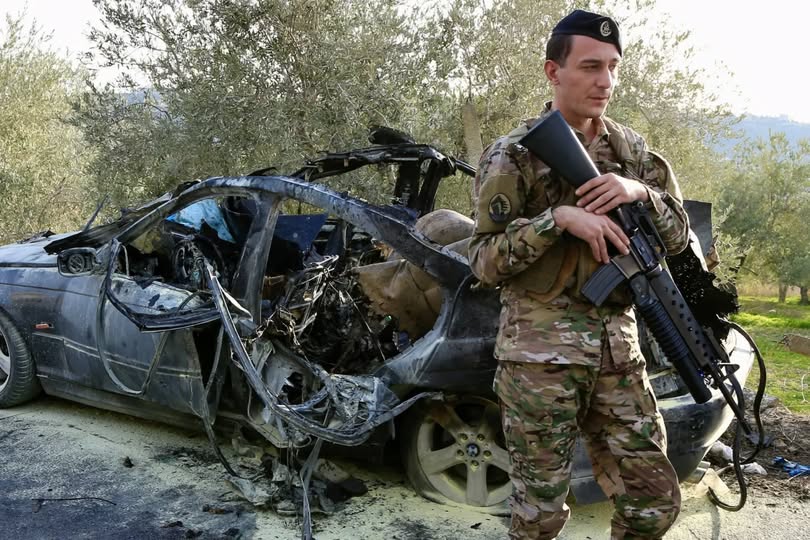 عنصر من الجيش اللبناني يقف قرب سيارة مستهدفة في بلدة عقتنيت بقضاء الزهراني استهدفتها غارة إسرائيلية الثلاثاء (إ.ب.أ)