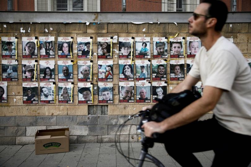 صور الرهائن المحتجزين في قطاع غزة تظهر على حائط في تل أبيب (رويترز)