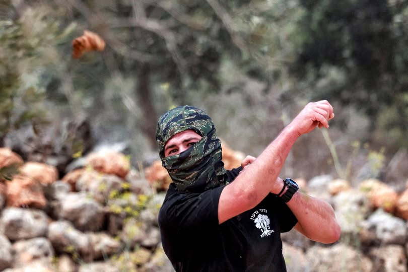 مستوطن ملثم يلقي حجارة في اتجاه فلسطينيين يقطفون الزيتون في الضفة الغربية بينما يقف خلفه جنود إسرائيليون (أ.ف.ب)