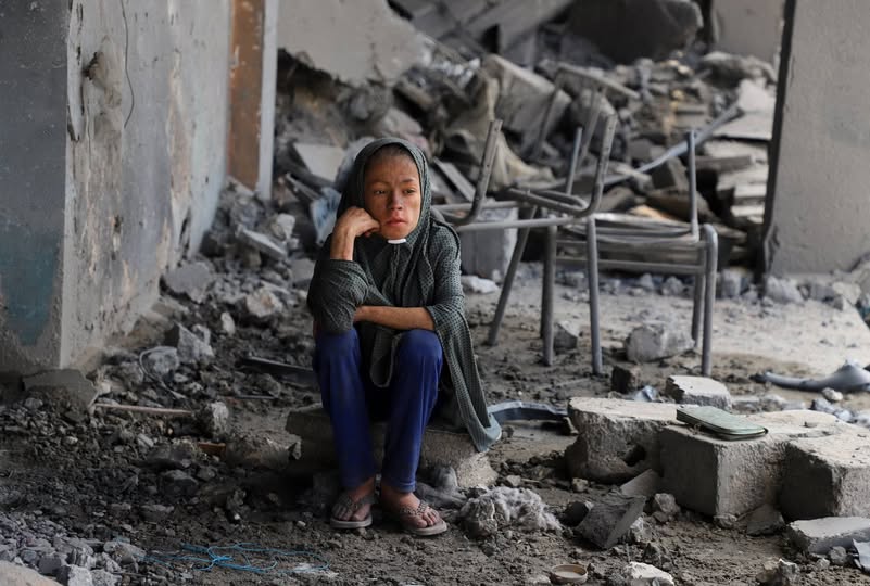 فلسطينية تجلس وسط الحطام في مدرسة تابعة للأمم المتحدة تؤوي نازحين بعد قصفها في حي الزيتون بمدينة غزة يوم الأربعاء (رويترز)