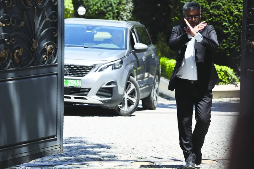 موظف يُشير بيده في أثناء مغادرة وفد أوروبي القنصلية الإيرانية عقب محادثات نووية بإسطنبول في 25 يوليو 2025 (إ.ب.أ)