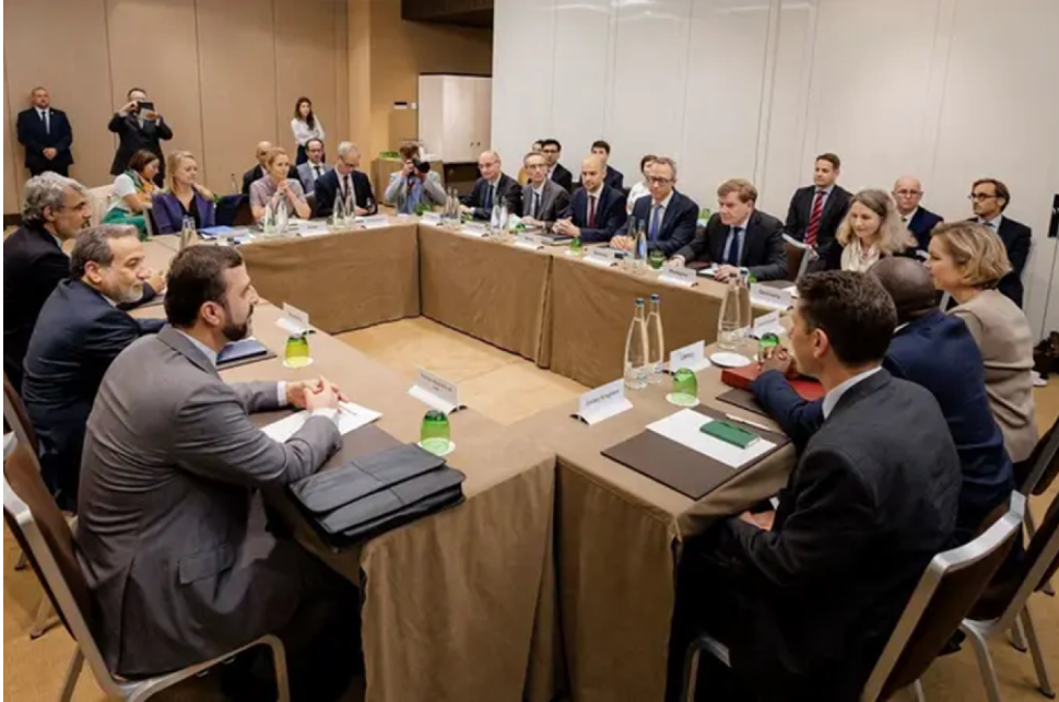 من اجتماع وزراء خارجية فرنسا وبريطانيا وألمانيا بنظيرهم الإيراني بالإضافة إلى مسؤولة السياسة الخارجية بالاتحاد الأوروبي في جنيف ، 20 يونيو 2025 (أ ف ب)