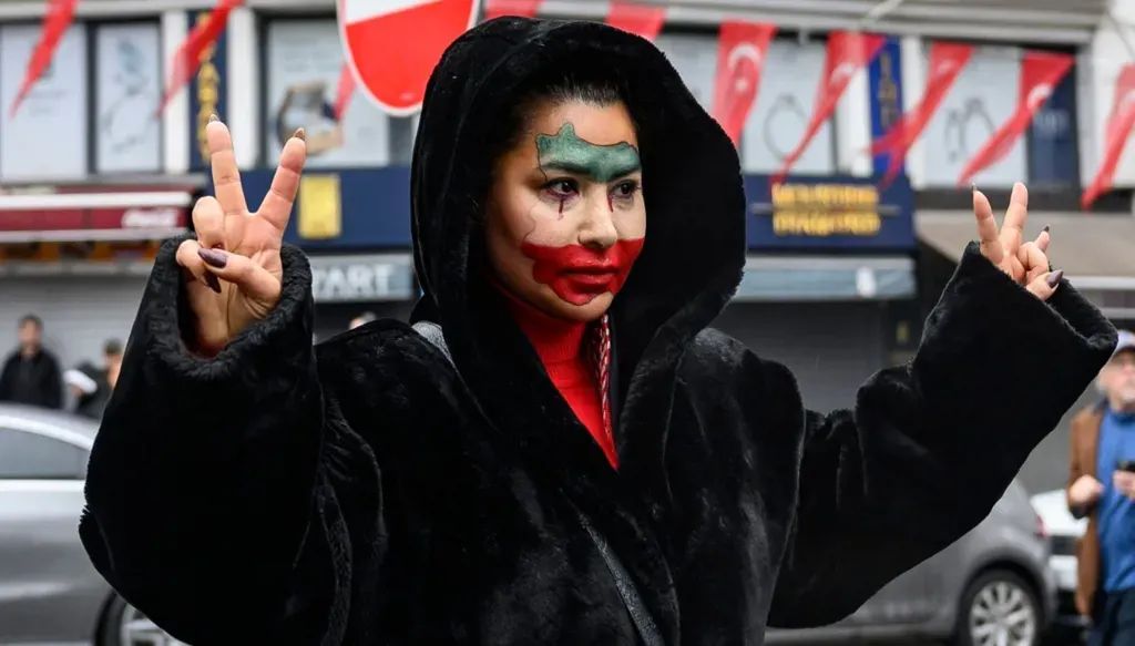 سيدة ترفع علامة النصر خلال مظاهرة أمام القنصلية الإيرانية في اسطنبول (أ ف ب)