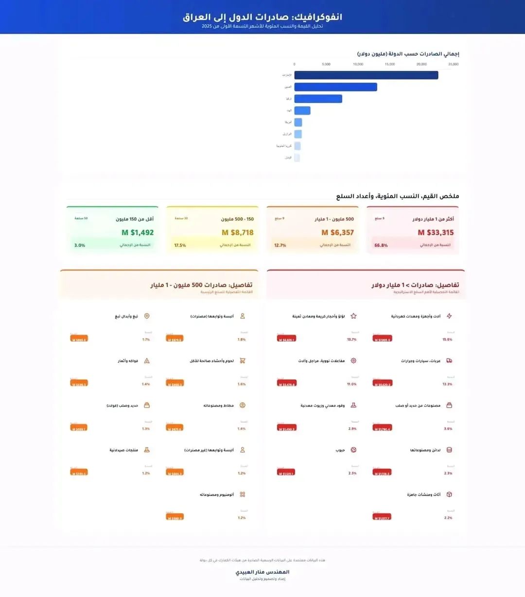وفي الوقت نفسه، كشفت البيانات عن تركّز كبير في الفئات السلعية المستوردة، إذ إن 9 فئات سلعية فقط من أصل 99 فئة معتمدة عالميًا استحوذت على أكثر من 67% من إجمالي قيمة الاستيرادات العراقية، وفقا للعبيدي.