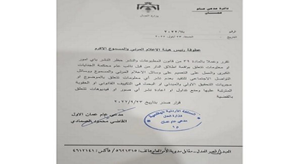 ومن جهته قرر المدعي العام في عمان حظر نشر أي معلومات عن “إطلاق النار من قبل شخصية قانونية معروفة، على زوجته وابنه في محافظة جرش” وفق وكالة الأنباء الرسمية.