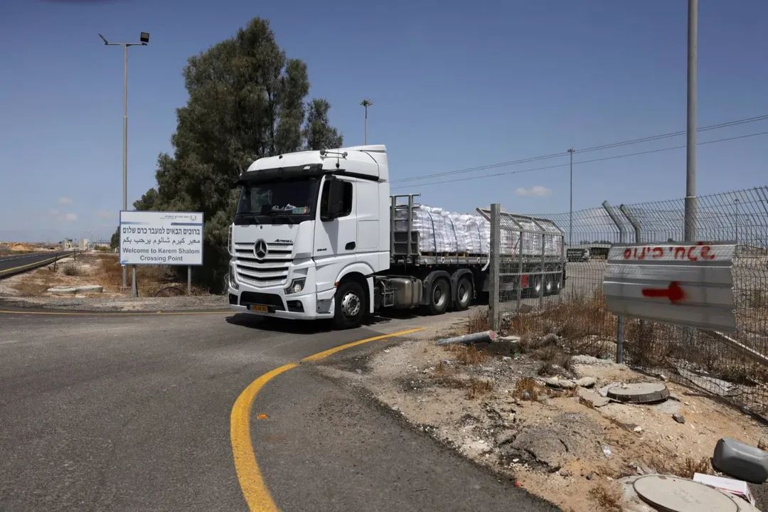 شاحنة تحمل مساعدات في طريقها إلى قطاع غزة من معبر كرم أبو سالم (رويترز)