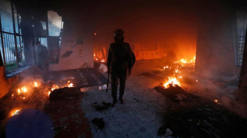 مقر أمني أحرقه المحتجون في ساحة التحرير ببغداد ليلة الثلاثاء (أ.ف.ب)بغداد: «الشرق الأوسط»