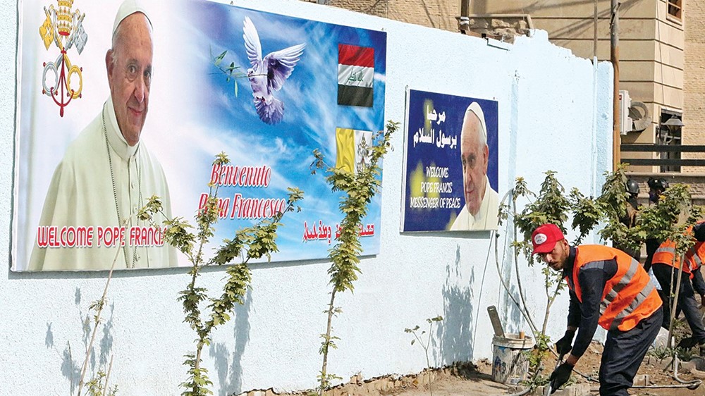 عراقيتان تقفان أمام لافتة ترحيب بالبابا فرنسيس في بغداد (أ ف ب)هدى جاسم، استهدفت عشرة صواريخ على الأقل، أمس، قاعدة عين الأسد التي تضم قوات أميركية في الأنبار بغرب العراق، حسبما أفادت مصادر أمنية عراقية وغربية، في هجوم أدى إلى وفاة متعاقد مدني مع التحالف الغربي، ويأتي قبل يومين من زيارة البابا فرنسيس التاريخية إلى العراق.ويذكّر هذا الهجوم بالصعوبات اللوجستية التي تحيط بزيارة البابا، لاسيما مع انتشار موجة ثانية من وباء «كوفيد- 19»، ووسط تدابير إغلاق لمكافحتها، لكن البابا أكد أمس أنه سيقوم بزيارته على الرغم من الهجوم الصاروخي، موضحاً في عظته الأسبوعية: «إن شاء الله سأذهب إلى العراق لزيارة حج من ثلاثة أيام». وقال البابا فرنسيس: «إنه ذاهب إلى العراق، الذي لم يتمكن البابا الراحل يوحنا بولس من التوجه إليه عام 2000، لأنه لا يمكن خذل الناس مرة ثانية».وناشد البابا فرنسيس بابا الكنيسة الكاثوليكية، المقرر أن يتوجه للعراق غداً، الدعاء والصلاة حتى تتم الزيارة «بأفضل طريقة ممكنة، وتحقق الثمار المرجوة». ولم يتطرق البابا إلى المشاكل الأمنية في العراق.وأضاف: «منذ فترة وأنا أرغب في لقاء هذا الشعب الذي عانى الكثير».وعانى الشعب العراقي ويلات الحروب، وقمع مقاتلي تنظيم «داعش». وسيزور البابا مدينة الموصل المعقل السابق للتنظيم الإرهابي، حيث ما يزال على الكنائس آثار الصراع.وقال البابا: «شعب العراق في انتظارنا.. كان في انتظار البابا يوحنا بولس الثاني، الذي لم يُسمح له بالذهاب، ولا يمكن خذل الشعب للمرة الثانية، فلندعُ من أجل أن تسير الرحلة على ما يرام».تمسك بالأملمن جانبه، أعلن الكردينال لويس روفائيل ساكو، بطريرك الكنيسة الكلدانية في العراق والعالم، أن أكثر من 100 شخصية مسلمة ستحضر الصلاة التي من المقرر أن يقيمها البابا يوم السبت المقبل في العراق.وقال ساكو، في مؤتمر صحفي للجنة المنظمة لزيارة البابا، إن «البابا فرنسيس سيقيم الصلاة في كنيسة سيدة النجاة، وسط العاصمة بغداد».وأضاف: «إن البابا سيتوجه يوم الأحد المقبل إلى أربيل للقاء مسؤولي الإقليم، وبعدها يزور الجانب الأيمن من الموصل ليظهر للعالم حجم الدمار، الذي لحق بنينوى جراء الإرهاب». وتابع ساكو: «سيعقد البابا لقاءً مع عدد من العراقيين المسيحيين والمسلمين في محافظة نينوى، وبعدها يزور سهل نينوى وقرقوش والحمدانية، من أجل التواصل والتمسك بالأمل والتعاون من أجل مستقبل أفضل».وأوضح أن «البابا سيوجه رسالة تضامن مع العراقيين حول الأخوة والعيش المشترك ونبذ الكراهية والعنف»، لافتاً إلى «ضرورة نبذ الخلافات والحروب العبثية، وهذا خطاب للعالم كله، ونشر قيم المحبة والتسامح».وأبرز وزير الثقافة حسن ناظم، جدول أعمال زيارة البابا التاريخية إلى العراق بآخر تحديث له، والتي ستبدأ الجمعة، وتنتهي الاثنين.وسيزور البابا كذلك مدينة أور، مسقط رأس النبي إبراهيم، عليه السلام، وسيجتمع مع المرجع العراقي علي السيستاني. وقال: «على أرض إبراهيم، ومع زعماء دينيين آخرين، سنتخذ خطوة أخرى باتجاه الأخوة بين المؤمنين». وسيقوم عشرة آلاف من أفراد الأمن بحماية البابا، المرجح أن يتحرك بسيارات مصفحة.وتقلص بشدة عدد من سيلتقون به شخصياً، بسبب القيود المفروضة للحد من تفشي فيروس «كورونا».ميدالية الفاتيكان إلى ذلك، أصدر الفاتيكان ميدالية تضم مجموعة من معالم العراق ورموزه، بمناسبة الزيارة التي يعتزم أن يجريها البابا فرنسيس إلى العراق. وتظهر الميدالية رموزاً عراقية، من بينها الأهوار والنخلة ونهرا دجلة والفرات.ويصدر الفاتيكان هذه الميدالية التي يقدمها البابا إلى بعض البلدان التي يزورها، وتعتبر رسالة يفصح عن مضمونها بابا الفاتيكان عند زيارته البلد أو المنطقة المعنية.«عين الأسد»وبشأن الهجوم، أوضح المتحدث باسم التحالف الدولي لمكافحة «داعش» في العراق واين ماروتو في تغريدة: «أن عشرة صواريخ استهدفت قاعدة عسكرية عراقية هي قاعدة عين الأسد التي تضم قوات من التحالف في 3 