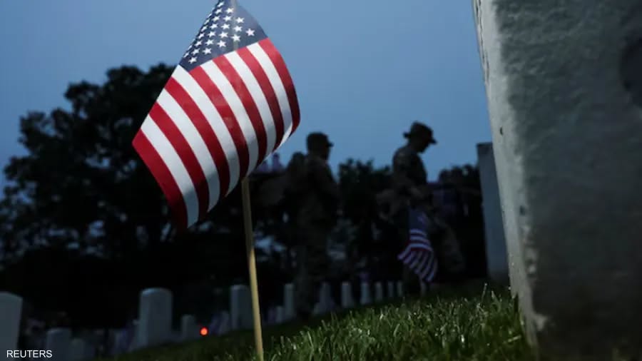 علم أميركا أمام شاهد قبر جندي بالجيش في مقبرة أرلينغتون