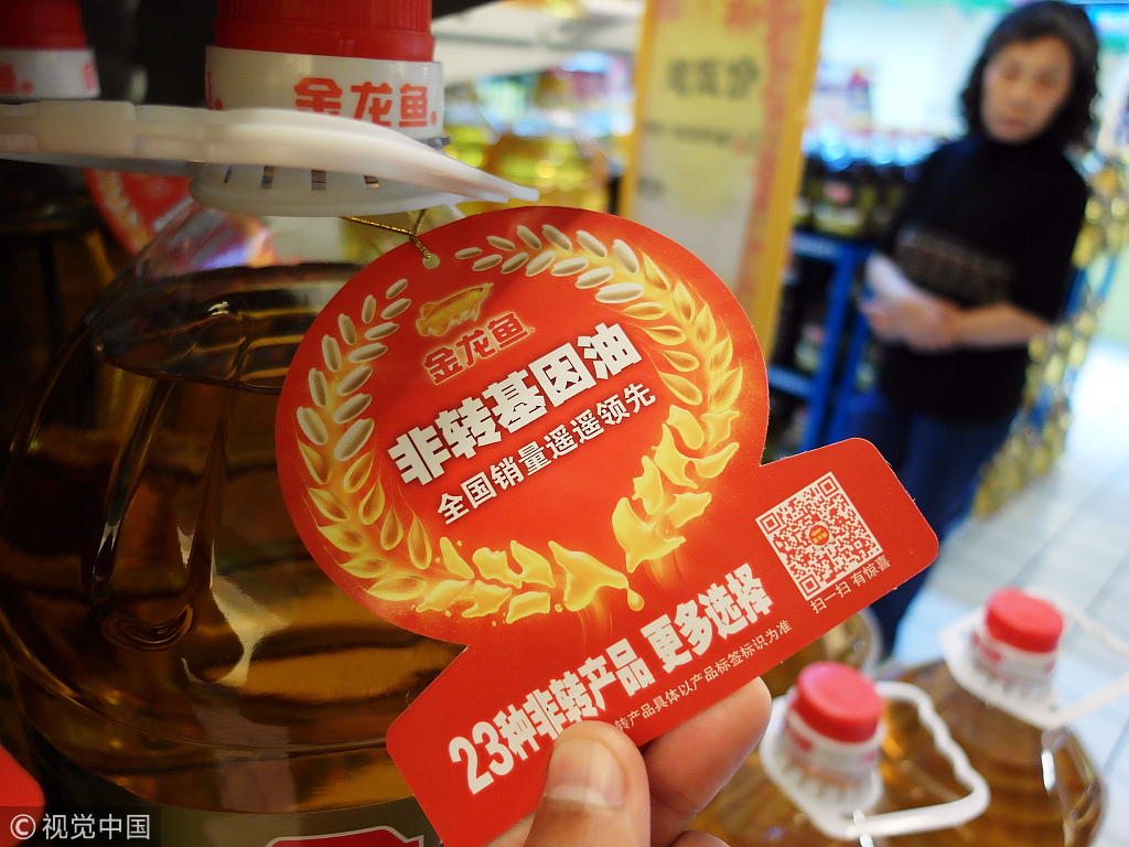 وصفت زجاجة زيت الطهي بأنها غير معدلة وراثيا في سوبر ماركت في ييتشانغ بمقاطعة هوبي.