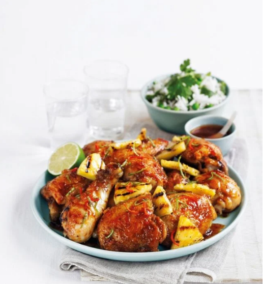 في غضون ذلك، تقطع شرائح الأناناس وتشوى على المصبع حتى تصبح ذهبية اللون. توزع شرائح الفليفلة الحريفة وبرش الليمون فوق قطع الدجاج، وتقدم مع قطع الأناناس المشوية، وقطع الليمون الباقية، والأرز والبازيلا والكزبرة.