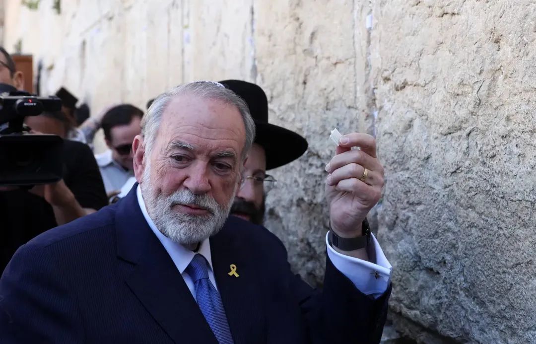 السفير الأميركي لدى إسرائيل مايك هاكابي خلال زيارة للحائط الغربي في البلدة القديمة بالقدس، 18 أبريل 2025 (رويترز)