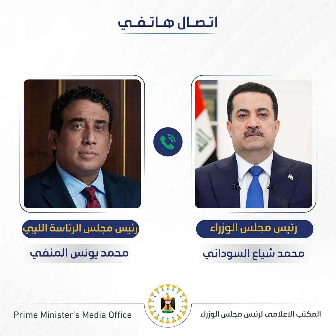 تلقى رئيس مجلس الوزراء محمد شياع السوداني، الاثنين 19 أيار 2025، اتصالاً هاتفياً من رئيس مجلس الرئاسة الليبي محمد يونس المنفي.