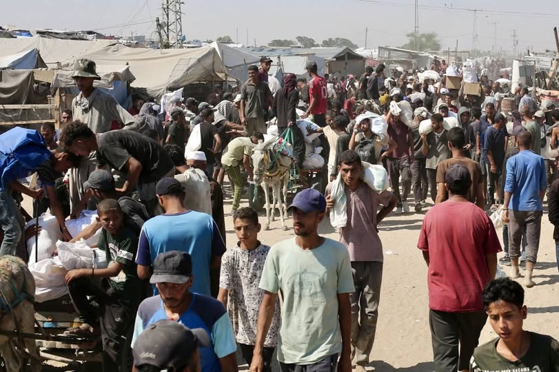 يحمل الناس طروداً وأكياساً غذائية في مخيم المواصي في رفح جنوب قطاع غزة، 27 يوليو 2025 (أ ف ب)