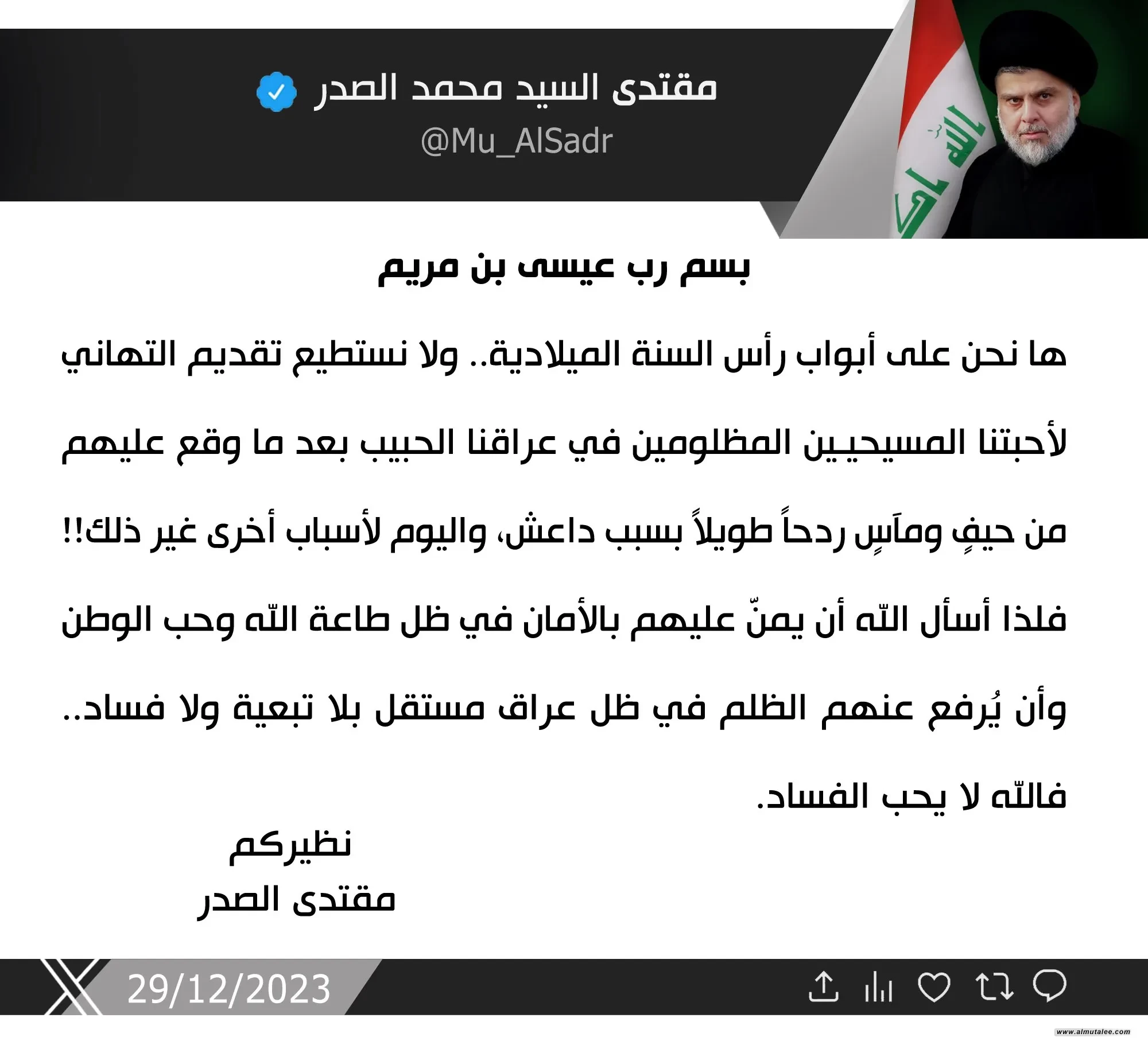 الصدر: لا نستطيع أن نهنئ المسيحيين المظلومين في عراقنا