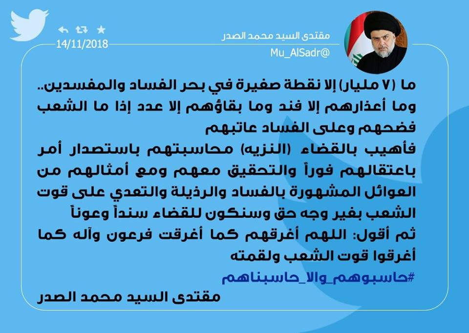 غرد السيد مقتدى الصدر ما 7 مليار الا نقطه صغيره في بحر الفساد والمفسدين .