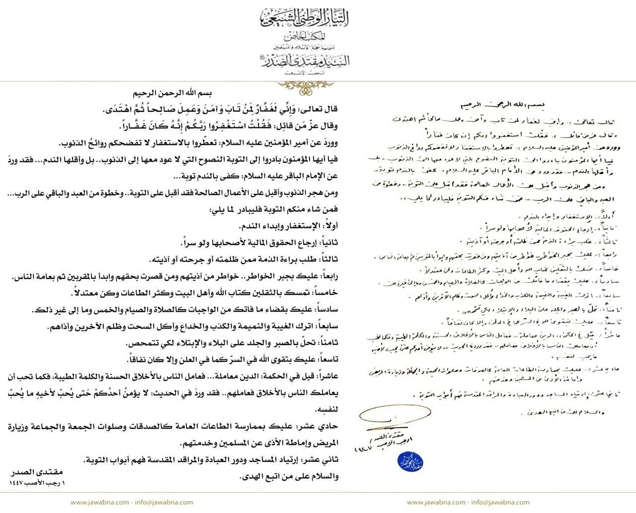 الصدر يصدر رسالة تحدد 12 شرطاً للتوبة