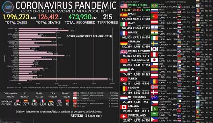 اقترب عدد المصابين بفيروس كورونا المستجد في عموم دول العالم من مليوني حالة فيما عبرت الوفيات 126 ألفا حتى إعداد هذا الخبر، وتتصدر الولايات المتحدة الأعداد.