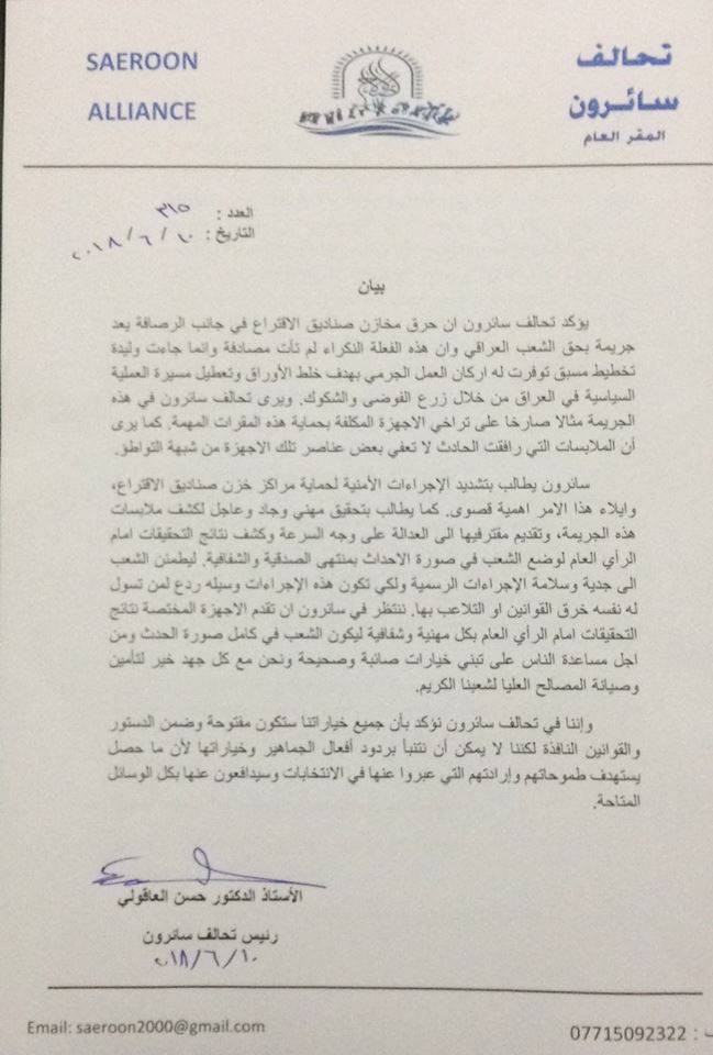 الى ذلك قال تحالف “سائرون” في بيان صدر اليوم ان “حريق المخازن الانتخابية جاء نتيجة تخطيط مسبق وبعض الشبهات تحوم حول عناصر من الأجهزة الأمنية”.
