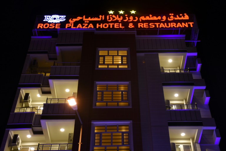 في وسط مدينة الرمادي، كبرى مدن المحافظة الغربية الصحراوية، تضيء الألوان الواجهات الأربع لفندق “روز بلازا السياحي” الأول في تاريخ الأنبار.