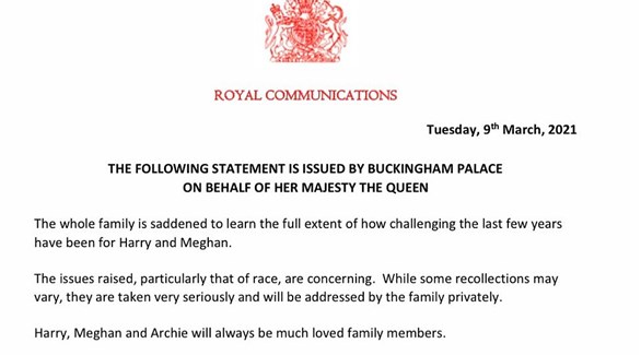 أعربت الملكة إليزابيث الثانية عن “حزنها” للمصاعب التي واجهها الأمير هاري وزوجته ميغان، مؤكدة أخذ مزاعمهما حول العنصرية “ستؤخذ على محمل الجدّ”، وفق بيان صدر عن قصر باكينغهام الثلاثاء في أول رد فعل على المقابلة المدوية للزوجين.