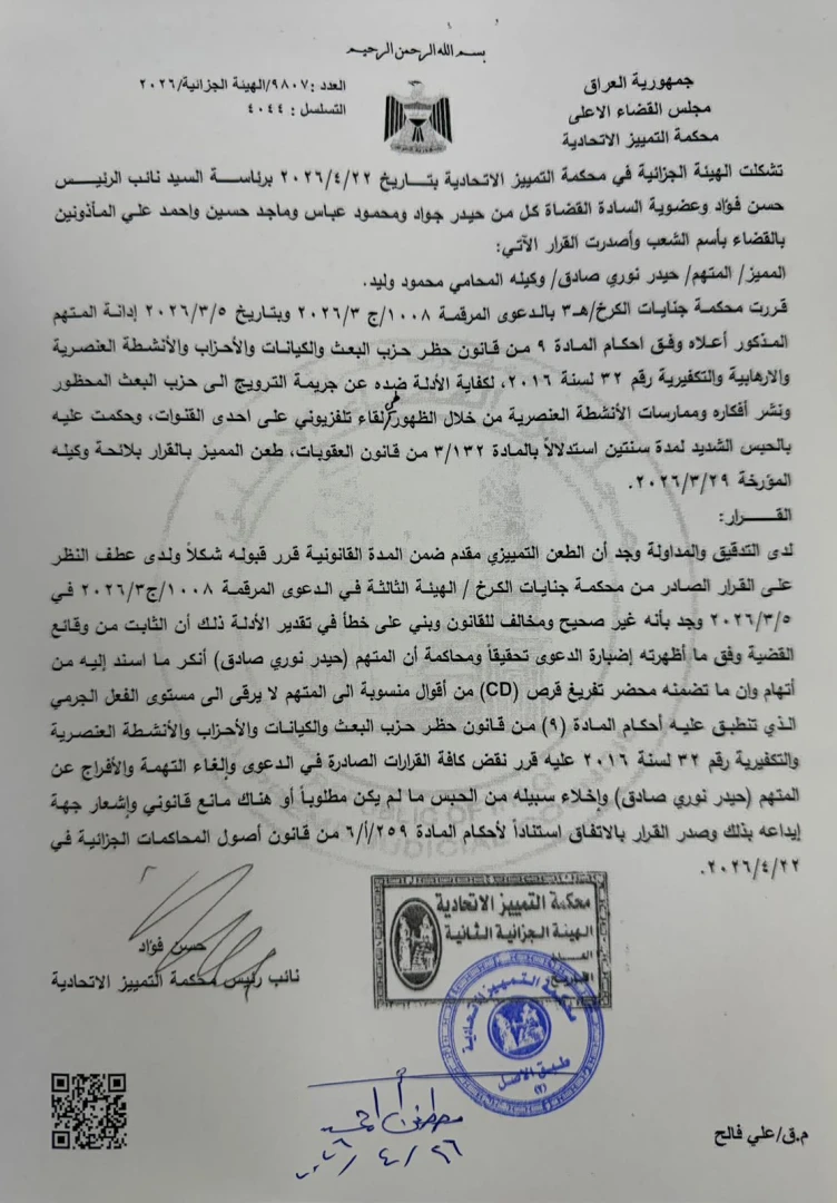 وبحسب وثيقة صادرة عن محكمة التمييز مُذيَّلة بتوقيع نائب رئيسها القاضي حسن فؤائد، فإنه وجد واعضاء الهيئة الجزائية في المحكمة بأن حكم محكمة جنايات الكرخ بحق المدان “غير صحيح، ومخالف للقانون، وبني على خطأ في تقدير الأدلة”، مؤكداً أن المُلّا أنكر ما أُسند إليه من اتهام، وأن ما تضمنه محضر تفريغ القرص المدمج الـ(CD) لا يرقى إلى مستوى الفعل الجرمي الذي تنطبق عليه أحكام المادة (9) من قانون حظر حزب البعث.