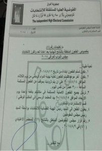 وتنص الوثيقة على انها باشرت بـ’تسلم الطعون ابتداء من اليوم 12 آب الجاري، ويكون آخر موعد لتسلم الطعون لغاية نهاية الدوام الرسمي من يوم الثلاثاء الموافق 14/8/2018، على أن يتم تزودينا بموقف عن الطعون المستلمة في الساعة الثالثة من عصر من نفس اليوم’.