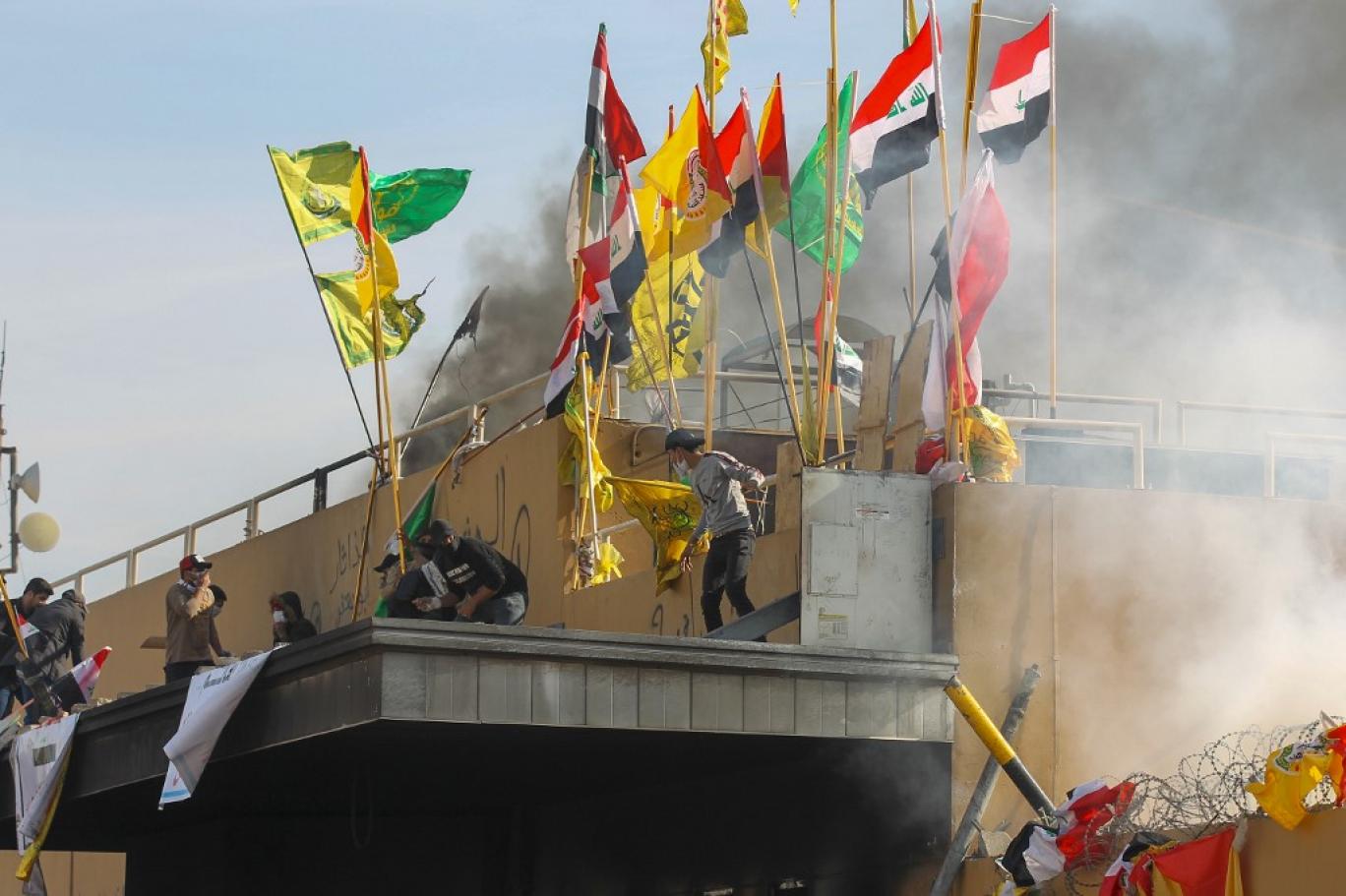 اتجهت إيران إلى تصعيد الموقف، فتحرَّك هادي العامري وقيس الخزعلي وغيرهما من قادة الحشد الموالي لها، بتظاهرة ضد السفارة الأميركيَّة، وبتواطؤ ملحوظ من رجال الأمن تسلل المتظاهرون إلى المنطقة الخضراء العصيَّة على الدخول، واقتحموا حدود السفارة، وأحرقوا بوابات الحمايَّة، لتنغص على إدارة ترمب ليلة رأس السنة الميلاديَّة، خصوصاً أن كتائب حزب الله نصبت خيام الاعتصام تجاه مبنى السفارة بالمنطقة الخضراء، معلنةً مرحلة مشابهة شيئاً ما لِما جرى للسفارة الأميركيَّة في طهران عام 1979.