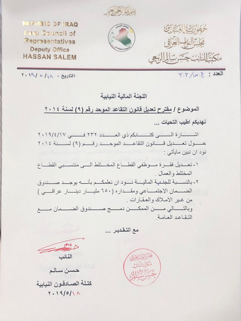 قدمت كتلة صادقون مقترح قانون لتعديل قانون التقاعد الموحد رقم ( 9 ) لسنة 2014.