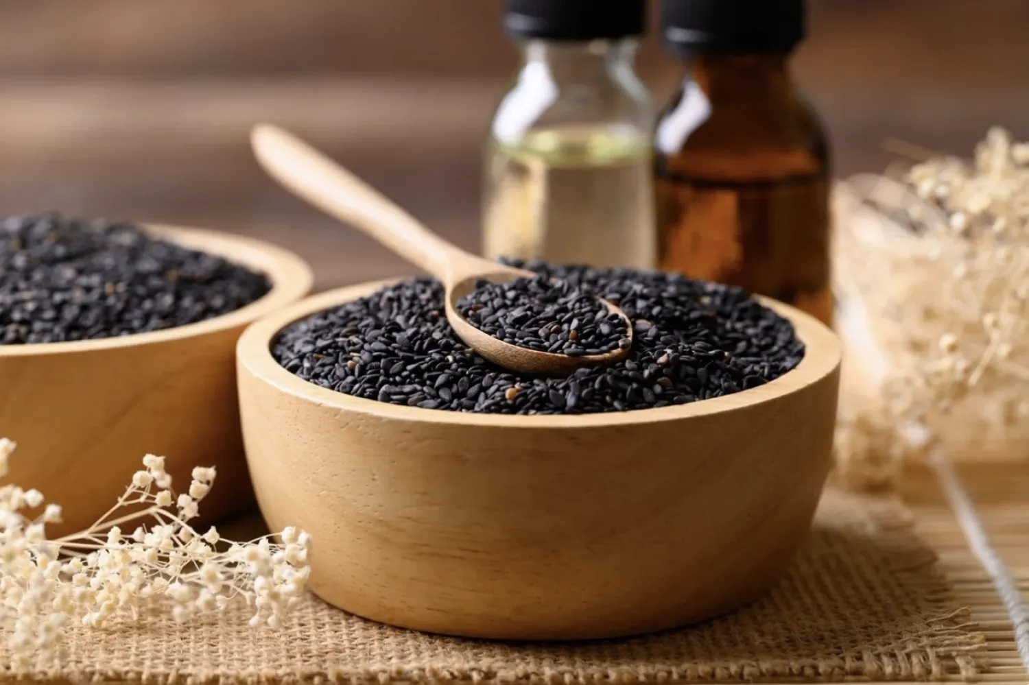 تشير الأبحاث إلى أن بذور السمسم الأسود يمكن أن تعزز نمو الشعر وتقلل من الشيب، وتقوي العظام، وتُحسّن مرونة الجلد، وتُعزز احتباس الرطوبة. تساهم بذور السمسم الأسود أيضاً في تحسين صحة القلب عن طريق خفض ضغط الدم ومستويات الكوليسترول، مع توفير فوائد وقائية للكبد والكلى.