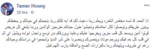 وتابع تامر حسني في رسالته: “ويسعد كل قلب حزين ويفرجها عليكم وعلينا ويرزقكم من أوسع وأجمل أبوابه ويشيل أي ألم في قلب كل حد فيكم ويرحم موتانا وينصركم وينصرنا على شر الدنيا وتنجحوا في دراستكم وحياتكم رغم أي ظروف ويلهمكم ربنا بالقرارات الصح والعاقله يارب اللهم تقبل”.