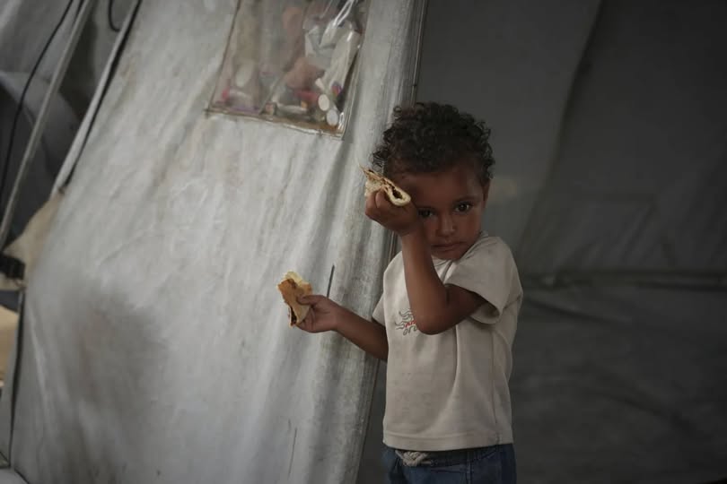 طفل فلسطيني يمسح العرق عن جبينه جراء الحرارة في خيمة عائلته بمدينة غزة الثلاثاء (أ.ب)