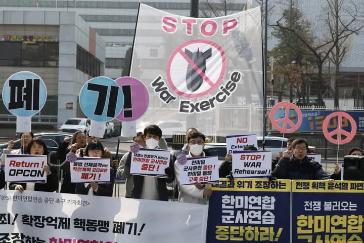 مظاهرة ضد التدريبات العسكرية الأميركية والكورية الجنوبية خارج وزارة الدفاع الوطني في سيول (إ.ب.أ)