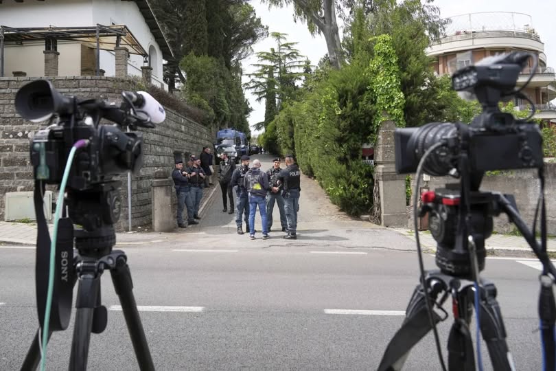 عناصر شرطة وصحافيون أمام مدخل سفارة سلطنة عمان في روما حيث جرت ثاني جولة تفاوض بين الولايات المتحدة وإيران 19 أبريل (أب)