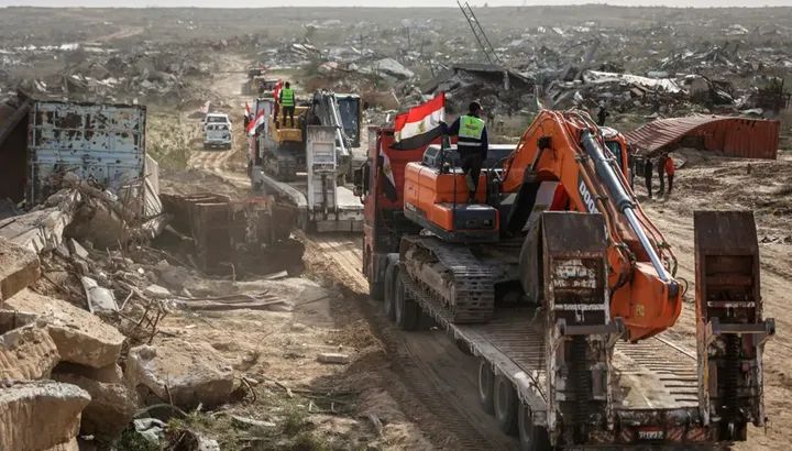 معدات تابعة للجنة مصرية تبحث برفقة أعضاء من اللجنة الدولية للصليب الأحمر عن رفات آخر رهينة إسرائيلي في حي الزيتون بمدينة غزة. (أ ف ب)