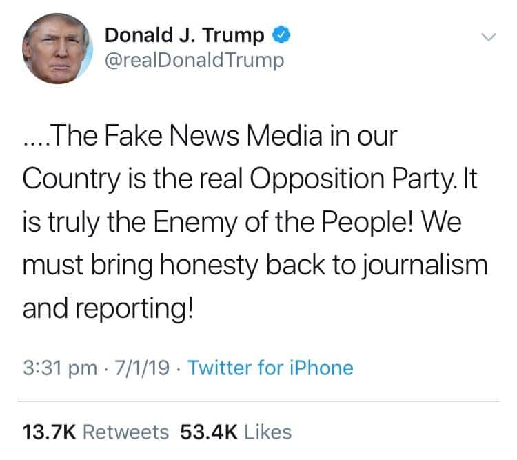 نشر “ترامب” عبر حسابه الشخصي على موقع التواصل الاجتماعي وتبادل التدوينات القصيرة “تويتر” تدوينة كتب فيها: “وسائل الإعلام الإخبارية المزيفة في بلدنا هي حزب المعارضة الحقيقي وهي العدو الفعلي للشعب”.