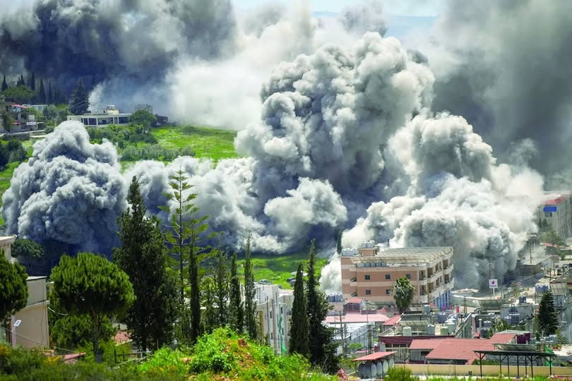 الدخان يتصاعد بعد غارة إسرائيلية على النبطية في جنوب لبنان أمس (رويترز)