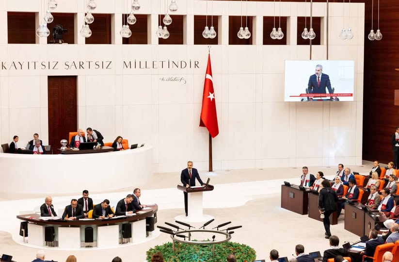 وزير خارجية تركيا هاكان فيدان يلقي كلمة أمام البرلمان بأنقرة أمس (رويترز)