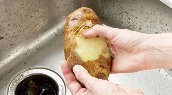 استخدمي الملقط أو الملعقة المشقوقة لإزالة البطاطس، ثم استخدمي إبهاميك لإزالة القشرة بسهولة.