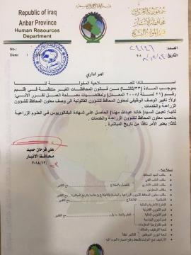 بالوثيقة محافظ الأنبار علي فرحان حميد يصدر أمراً إدارياً يقضي بتغيير الوصف الوظيفي لمعاون المحافظ للشؤون القانونية إلى وصف معاون المحافظ للشؤون الزراعية، كذلك يتضمن الأمر تعيين خالد عبد الله مهنا بالمنصب.