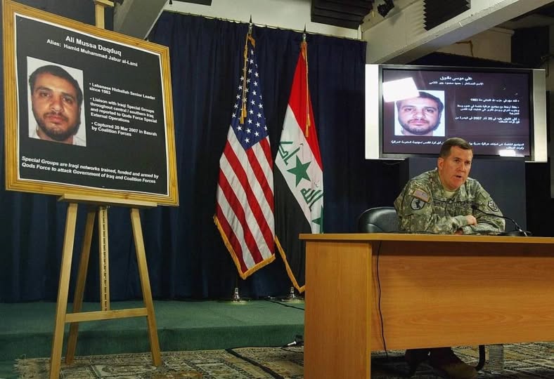 الضابط الأميركي كيفين بيرغنير يعلن للصحافيين في بغداد اعتقال علي موسى دقدوق 2 يوليو (تموز) 2007 (أ.ف.ب – غيتي)