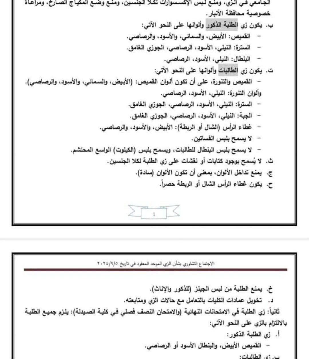 وبحسب وثيقة صادرة عن اجتماع تشاوري بشأن الزي الموحد بتاريخ (5 أيلول 2024)، وتلقاها NRTعربية، أنه “يمنع ارتداء الملابس القصيرة والضيقة ومنع لبس الاكسسوارات ولكلا الجنسين، ومنع وضع المكياج الصارخ، مراعاة لخصوصية محافظة الأنبار، ووفقا للأعراف المجتمعية.