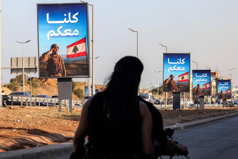 لافتات داعمة للجيش اللبناني مثبتة على طريق مطار رفيق الحريري في بيروت (أ.ف.ب)