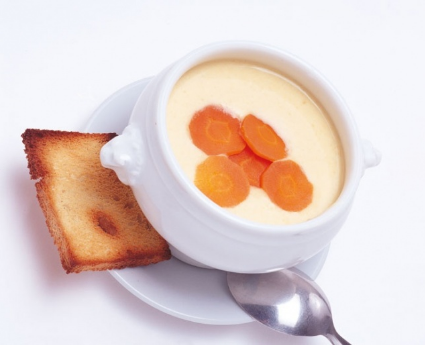 يقدم الحساء ساخناً مع الخبز المحمص.