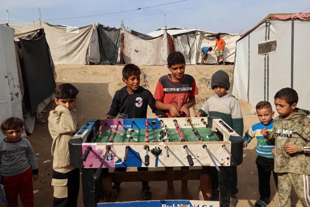 أطفال فلسطينيون يلعبون «البيب فوت» في مخيم النصيرات وسط قطاع غزة السبت (أ.ف.ب)