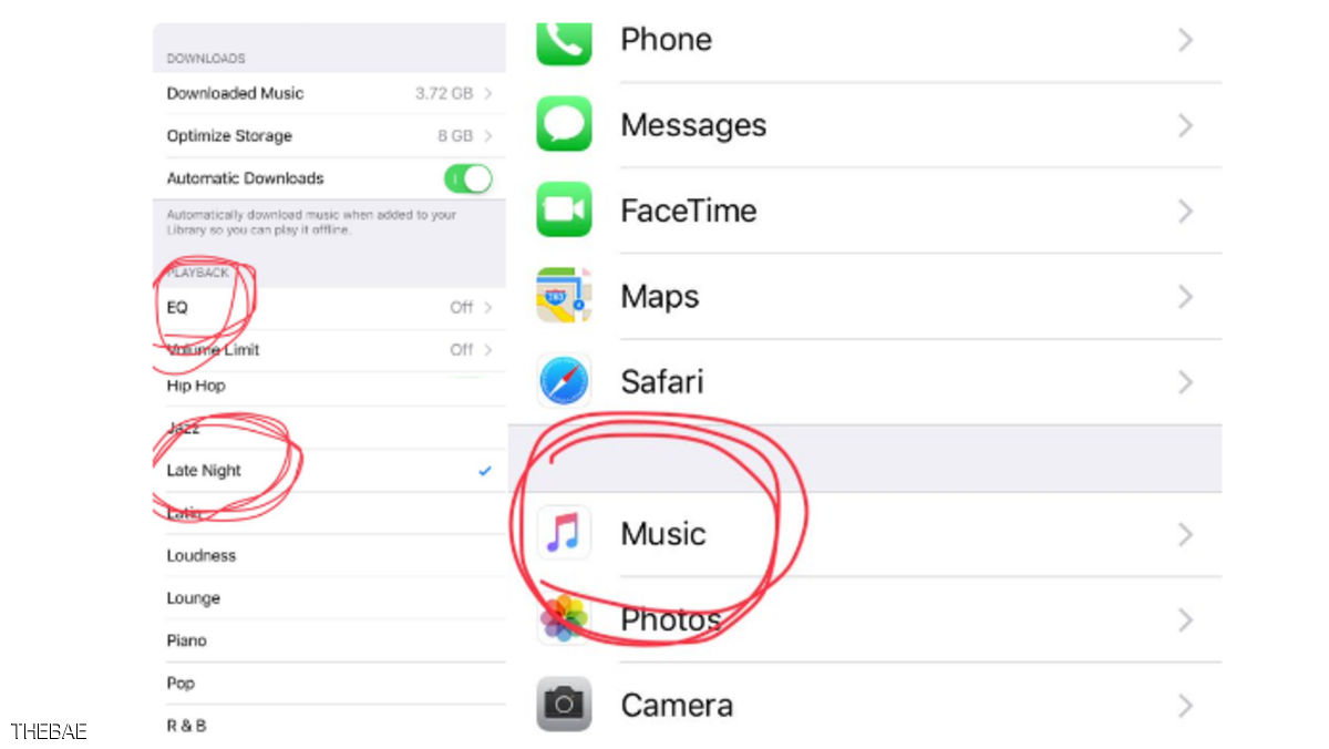 ومن أجل تشغيل الموسيقى بصوت أعلى، يكفي أن تدخل إلى قائمة الإعدادات “Settings” ثم Music، ثم خاصية EQ، وبعدها تختار Late Night.