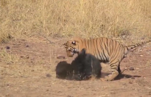 وروى أكشاي كومار، الذي صوّر العراك خلال تجواله مع السياح في المحمية الأسبوع الماضي، أن النمر هاجم الصغير طوال خمس دقائق قبل أن تسيطر الدبّة على ساحة القتال تدريجيا.